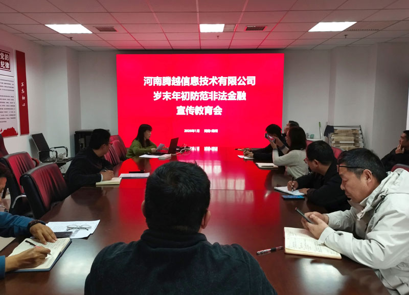 1月14日,河南腾越信息技术有限公司召开岁末年初防范非法金融宣传教育会暨一季度安全生产工作会议。公司全体员工参加会议。